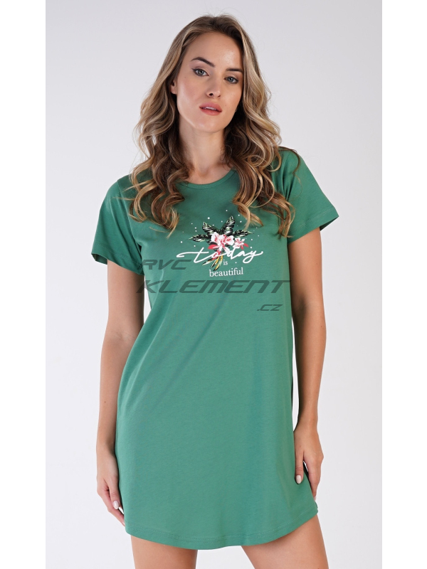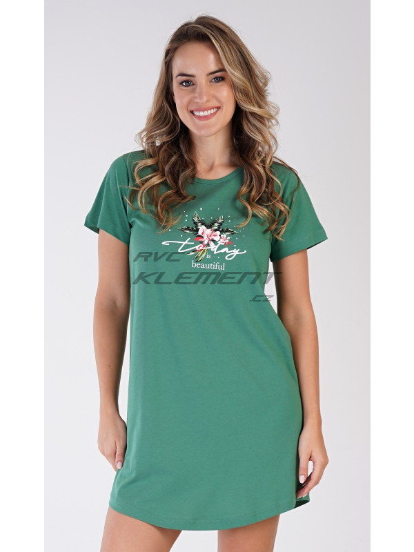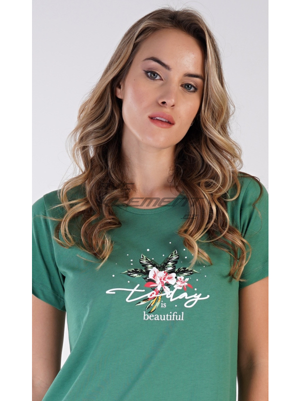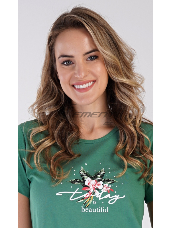 Dámská bavlněná noční košile s krátkým rukávem Beautiful. Dámská noční košile s kulatým výstřihem je ve smaragdové barvě, na hrudi má nápis ’Today is beautiful’ a obrázek exotických květů. Použitý materiál s obsahem bavlny 100% je příjemný a poddajný na dotek.