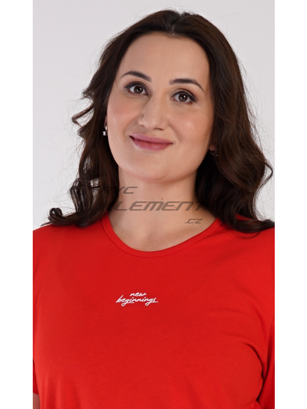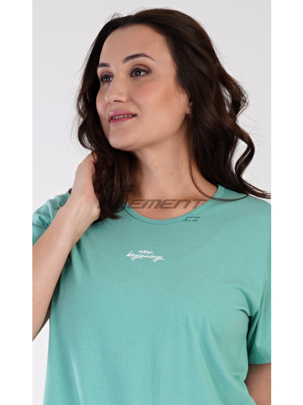 Dámská bavlněná noční košile s krátkým rukávem Alena. Noční košile s kulatým výstřihem má na hrudi má drobný nápis ’New beginnings’ a ve spodní části potisk květů. Použitý materiál s obsahem bavlny 100% je příjemný a poddajný na dotek.