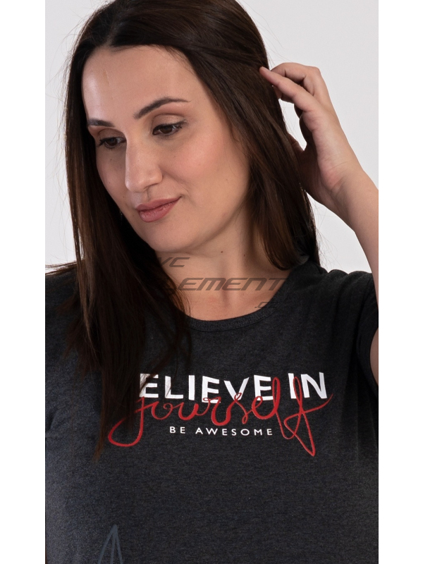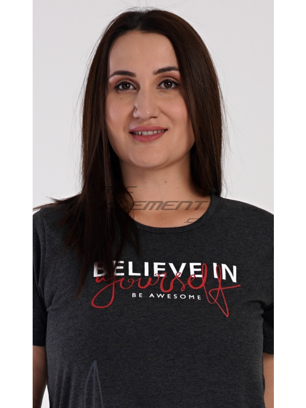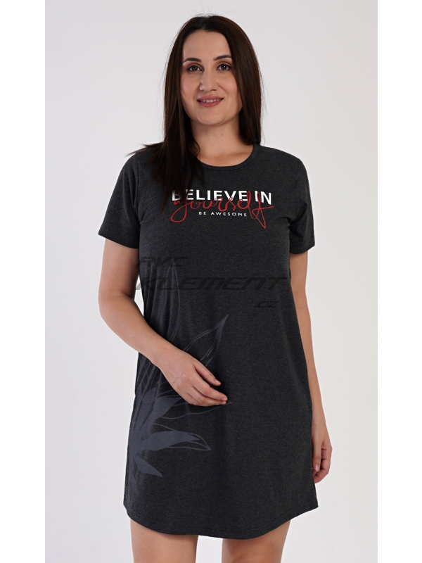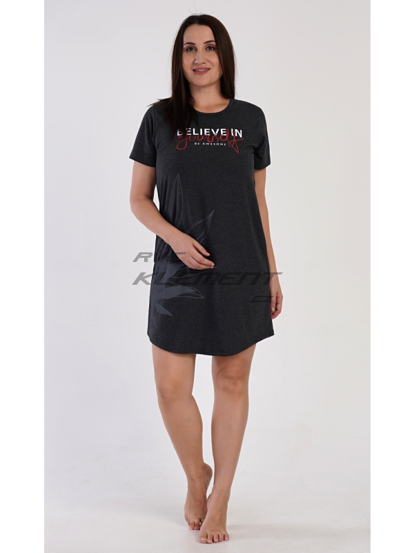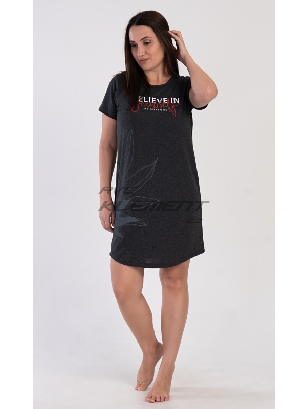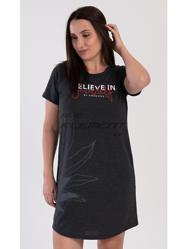 Dámská noční košile s krátkým rukávem Katka. Dámská noční košile s krátkým rukávem Katka. Dámská noční košile s kulatým výstřihem je v antracitové barvě, na hrudi má nápis ’Believe in yourself be awesome’ a na boku potisk listů. Použitý materiál s obsahem bavlny 50% je příjemný a poddajný na dotek. Pokyny pro údržbu: - 50% bavlna, 50% polyester Míry naměřené na výrobku:
