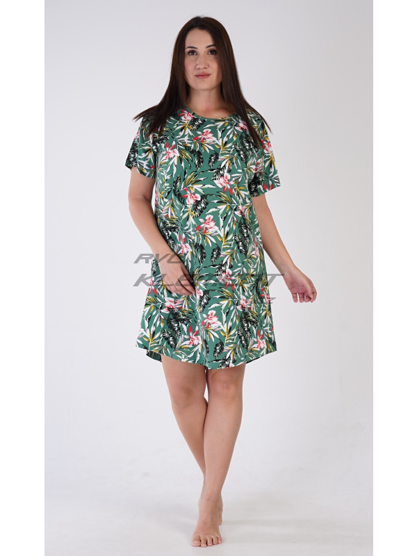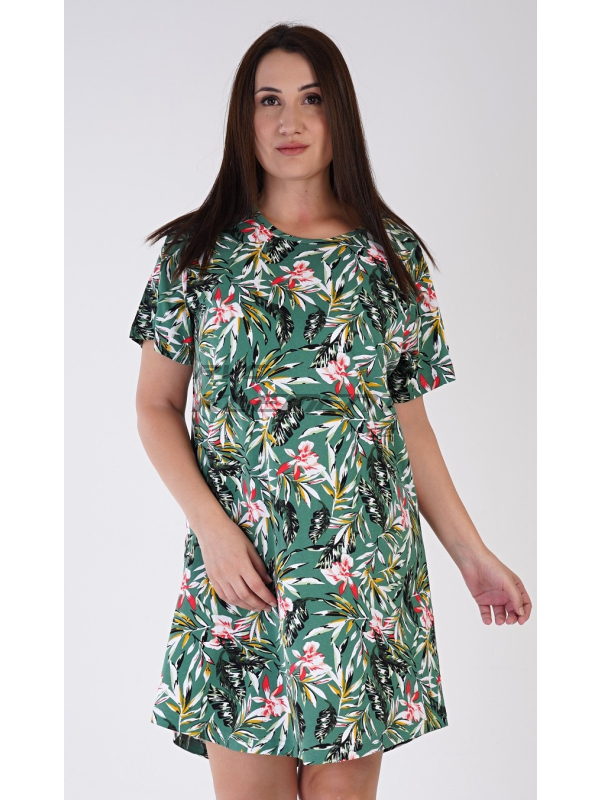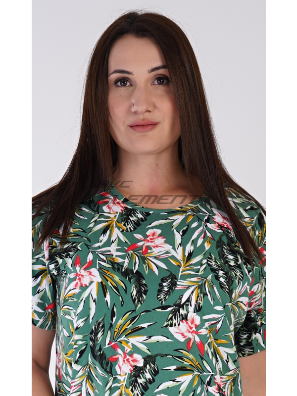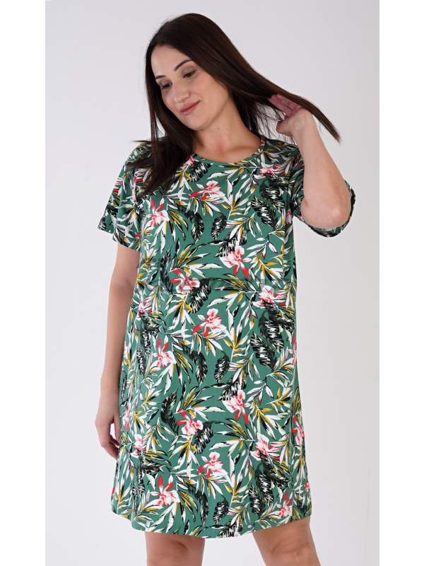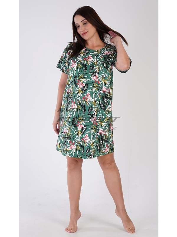 Dámská noční košile s krátkým rukávem Michelle. Dámská bavlněná noční košile s krátkým rukávem Michelle. Dámská noční košile s kulatým výstřihem má příjemnou délkou nad kolena. Košile s krátkým rukávem je potištěna motivy džungle, převažuje smaragdová barva. Použitý bavlněný materiál je příjemný a poddajný na dotek. Pokyny pro údržbu: - 100% bavlna Míry naměřené na výrobku: