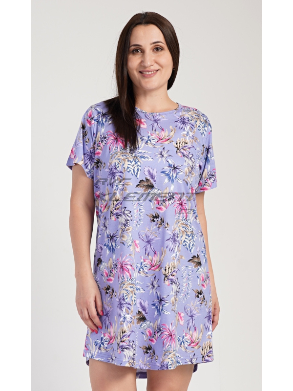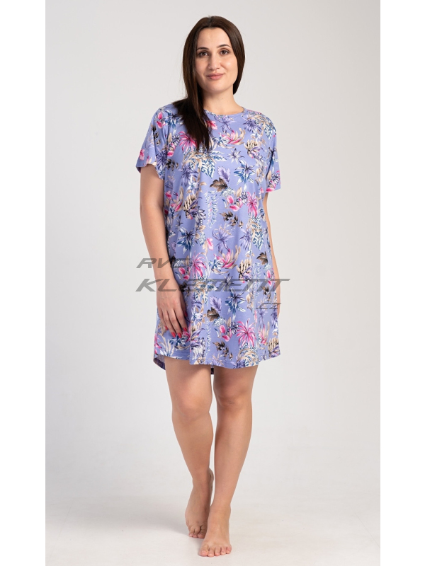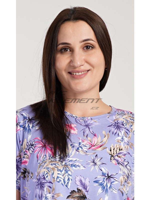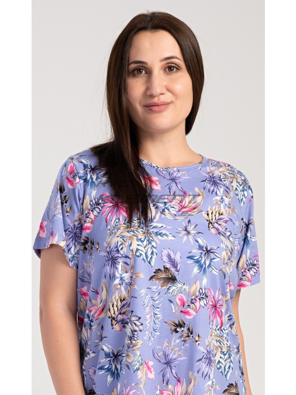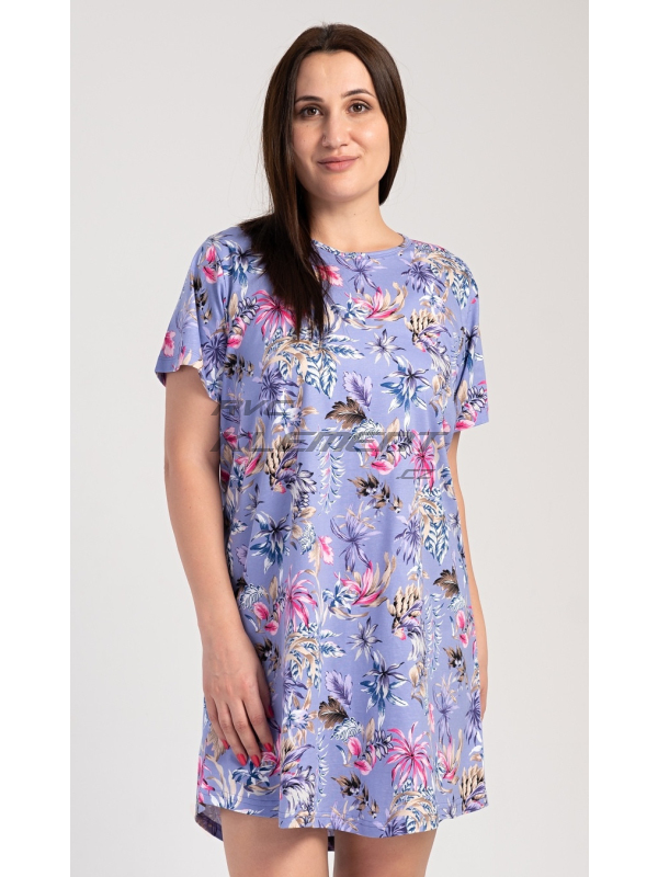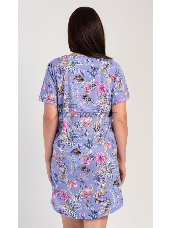 Dámská bavlněná noční košile s krátkým rukávem Betty. Dámská noční košile s kulatým výstřihem má příjemnou délkou nad kolena. Košile s krátkým rukávem je potištěna exotickými květy. Použitý bavlněný materiál je příjemný a poddajný na dotek.