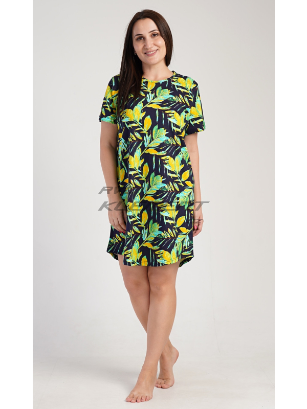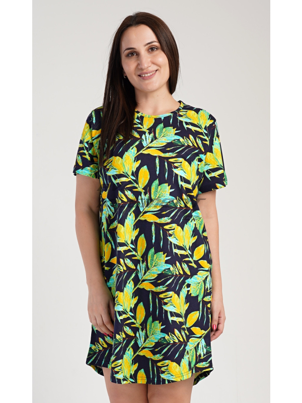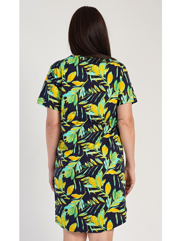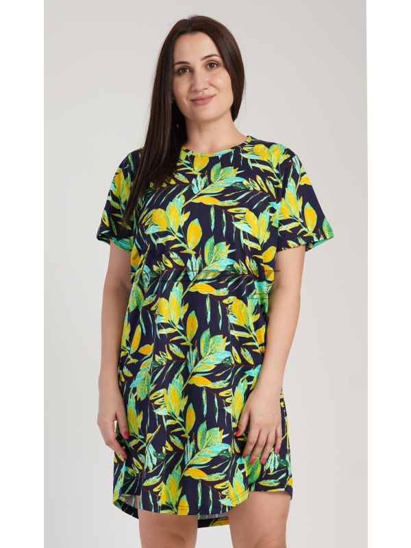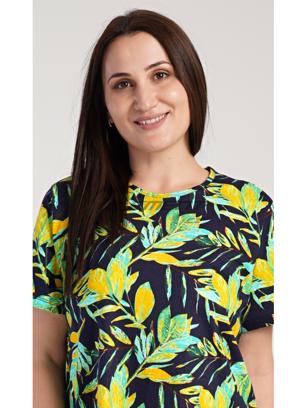 Dámská bavlněná noční košile s krátkým rukávem Paulína. Dámská bavlněná noční košile s krátkým rukávem Paulína. Dámská noční košile s kulatým výstřihem má příjemnou délkou nad kolena. Tmavě modrá košile s krátkým rukávem je potištěna větvičkami a listy v kontrastní žluté a zelené barvě. Použitý bavlněný materiál je příjemný a poddajný na dotek. Pokyny pro údržbu: - 100% bavlna Míry naměřené na výrobku: