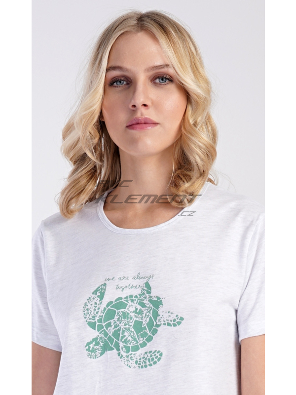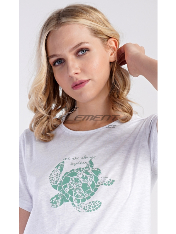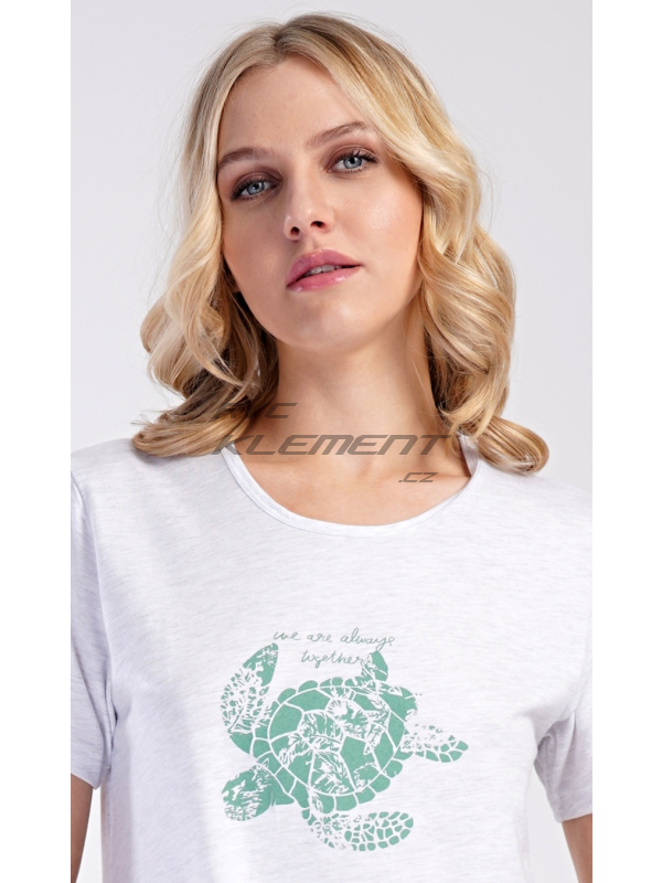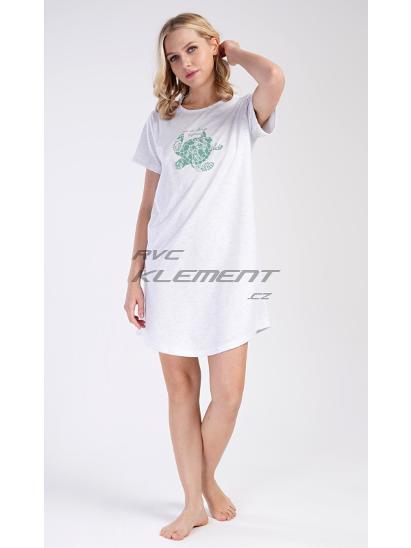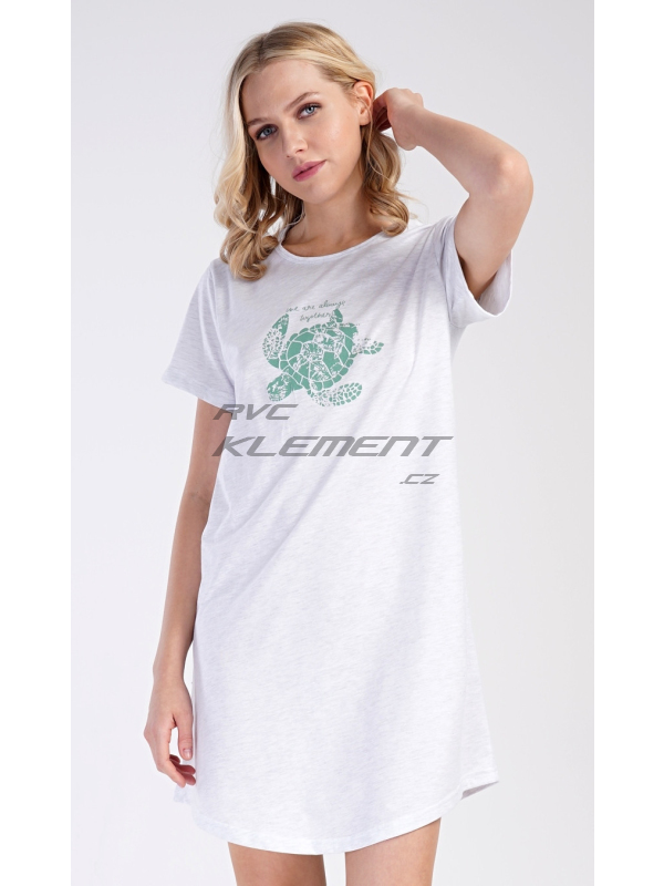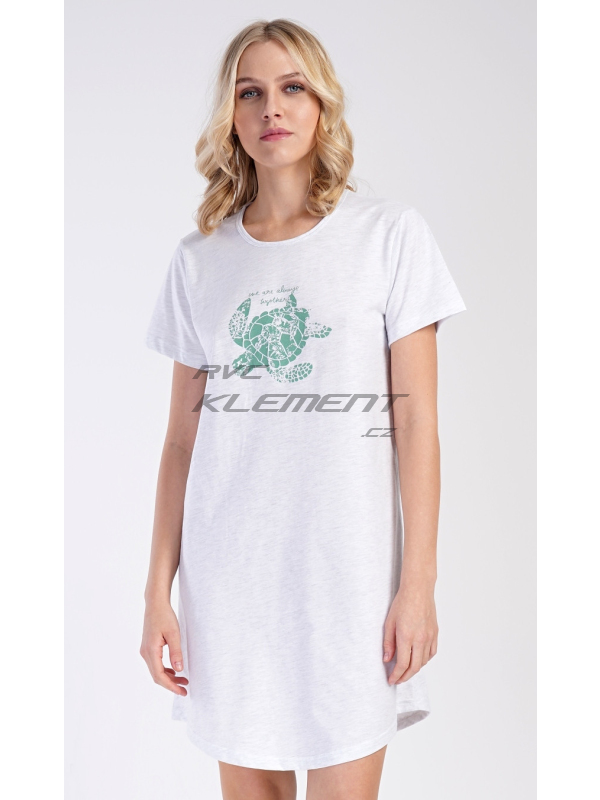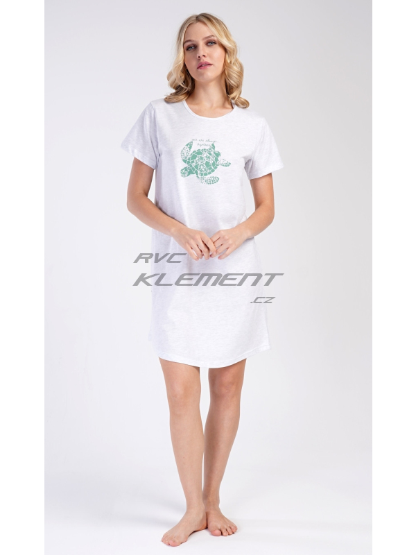 Dámská noční košile s krátkým rukávem Želva. Noční košile s kulatým výstřihem a příjemnou délkou nad kolena má na hrudi obrázek želvy a drobný nápis. Použitý materiál s obsahem bavlny 70% je příjemný a poddajný na dotek.