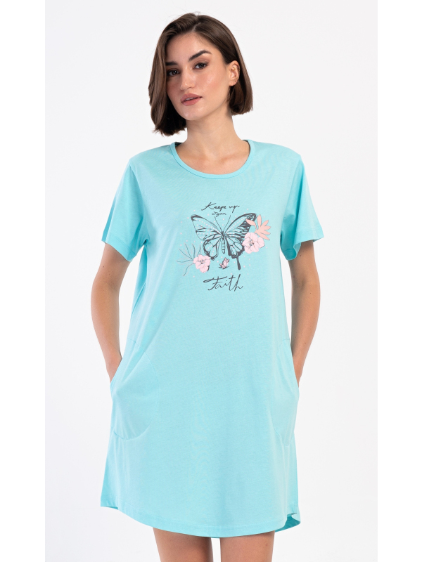 Dámské bavlněné domácí šaty s krátkým rukávem Motýl. Dámské bavlněné domácí šaty s krátkým rukávem Motýl. Domácí šaty s kulatým výstřihem a kapsami mají na hrudi obrázek motýla a nápis ’Keep up your faith’. Použitý bavlněný materiál je příjemný a poddajný na dotek. Šaty jsou pohodlné, využijete je téměř při všech volnočasových aktivitách. Jsou vhodné na spaní i na denní nošení. | ||||||