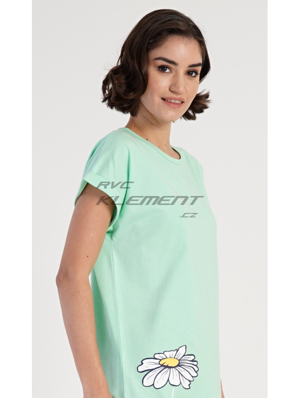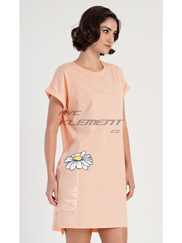 Dámská bavlněná noční košile s krátkým rukávem Matylda. Noční košile s kulatým výstřihem má ohrnuté krátké rukávy a příjemnou délkou nad kolena. Ve spodní části je ozdobena květem kopretiny. Použitý materiál s obsahem bavlny 100% je příjemný a poddajný na dotek.
