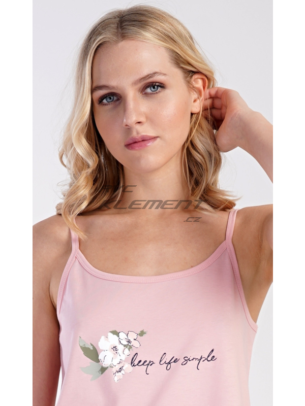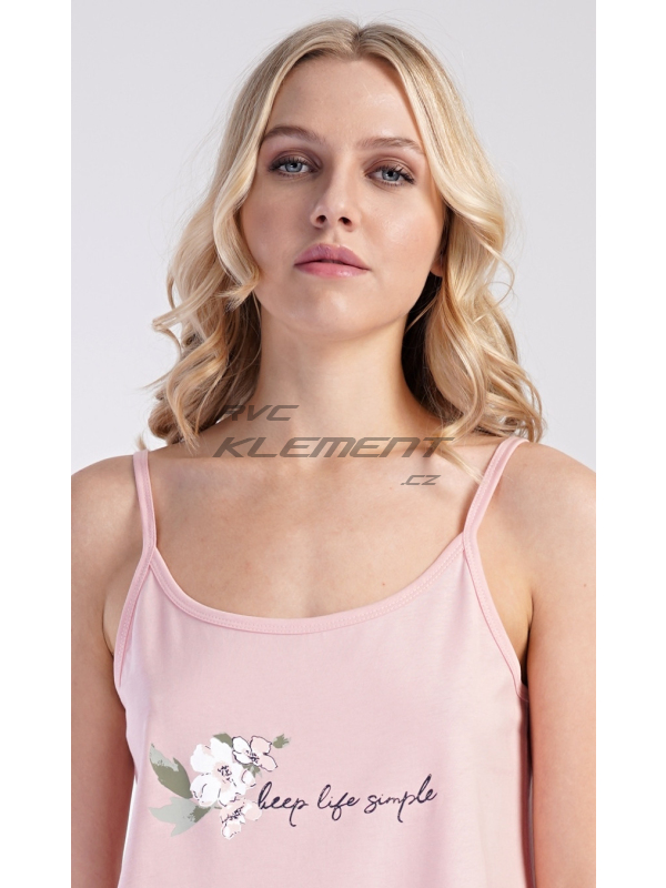 Dámská noční košile na ramínka Zuzana. Dámská bavlněná noční košile na ramínka Zuzana. Dámská noční košilka na ramínka s příjemnou délkou nad kolena je ozvláštněna obrázkem jemných bílých květů a drobným nápisem ’Keep life simple’. Použitý materiál s obsahem bavlny 100% je příjemný a poddajný na dotek. Pokyny pro údržbu: - 100% bavlna Míry naměřené na výrobku: