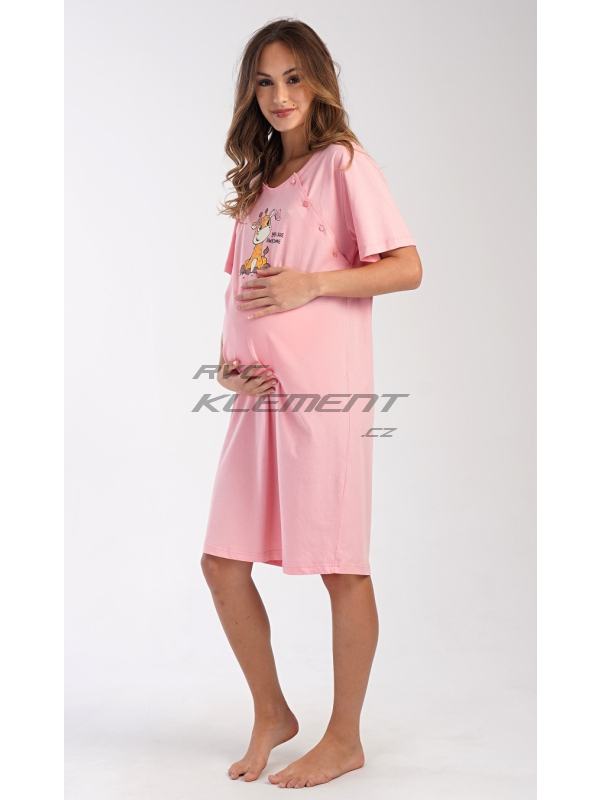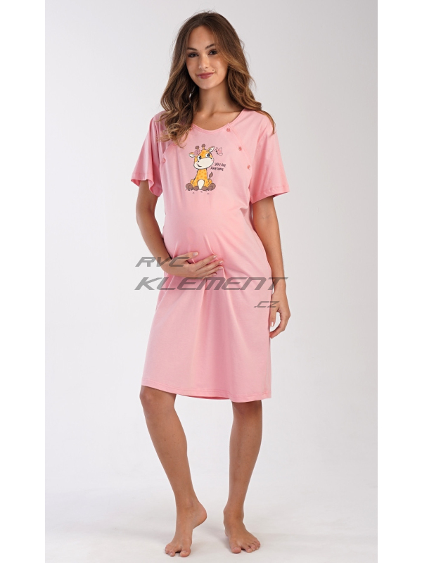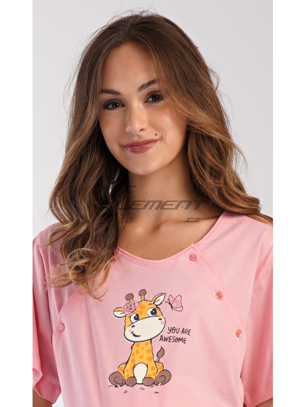 Dámská mateřská noční košile Malá žirafa. Dámská bavlněná mateřská noční košile Malá žirafa. Noční košile je svým střihem určená na dobu těhotenství, do porodnice i ke kojení. Ke kojení slouží průstřihy po stranách košile, které jsou uzavíratelné na knoflíky. Přední díl košile zdobí obrázek malé žirafy a nápis ’You are awesome’. Použitý materiál s podílem bavlny 100% je příjemný a poddajný na dotek. Pokyny pro údržbu: - 100% bavlna Míry naměřené na výrobku: