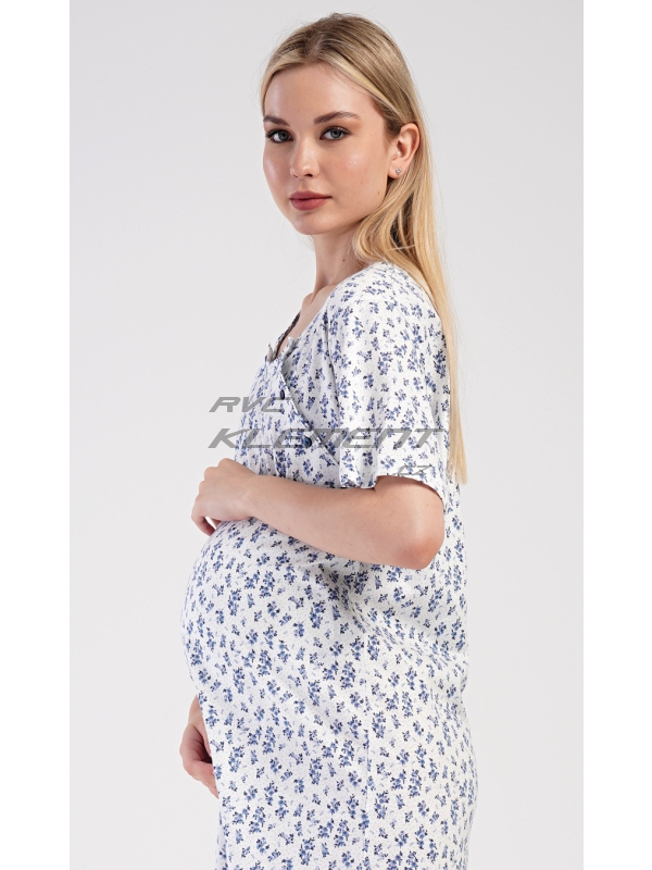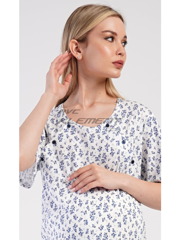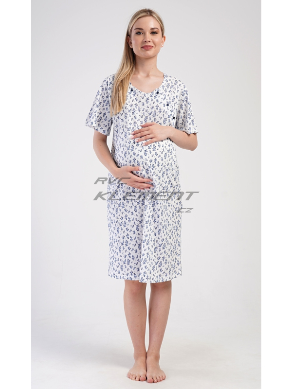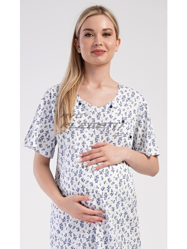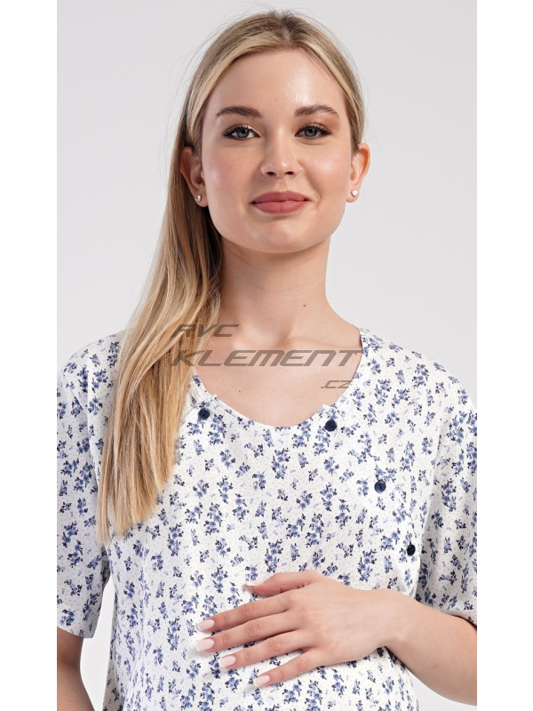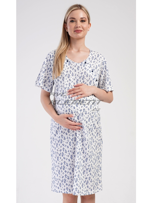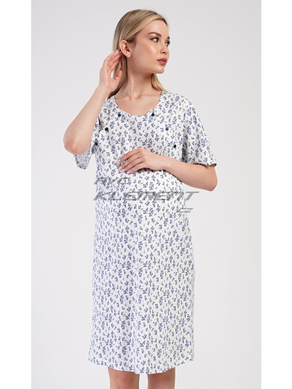 Dámská mateřská noční košile Flowers. Dámská bavlněná mateřská noční košile Flowers. Noční košile je svým střihem určená na dobu těhotenství, do porodnice i ke kojení. Ke kojení slouží průstřihy po stranách košile, které jsou uzavíratelné na knoflíky. Košile je potištěna drobnými modrými květy. Použitý materiál s podílem bavlny 100% je příjemný a poddajný na dotek. Pokyny pro údržbu: - 100% bavlna Míry naměřené na výrobku:
