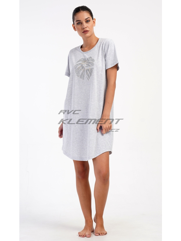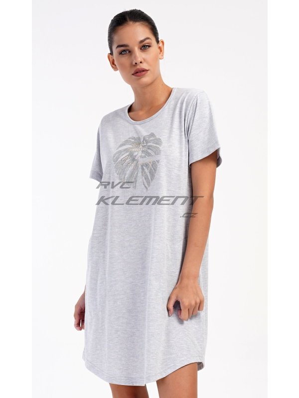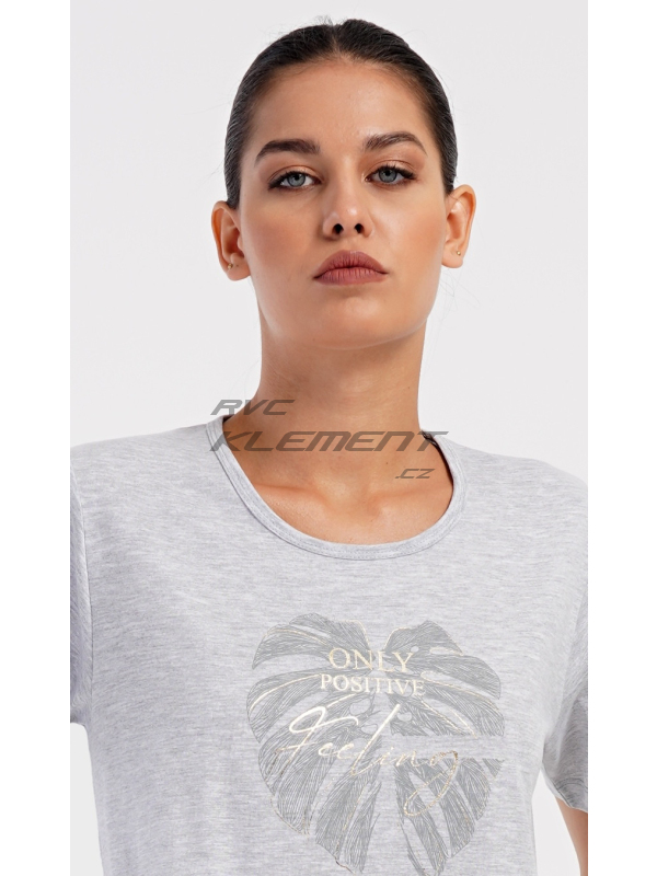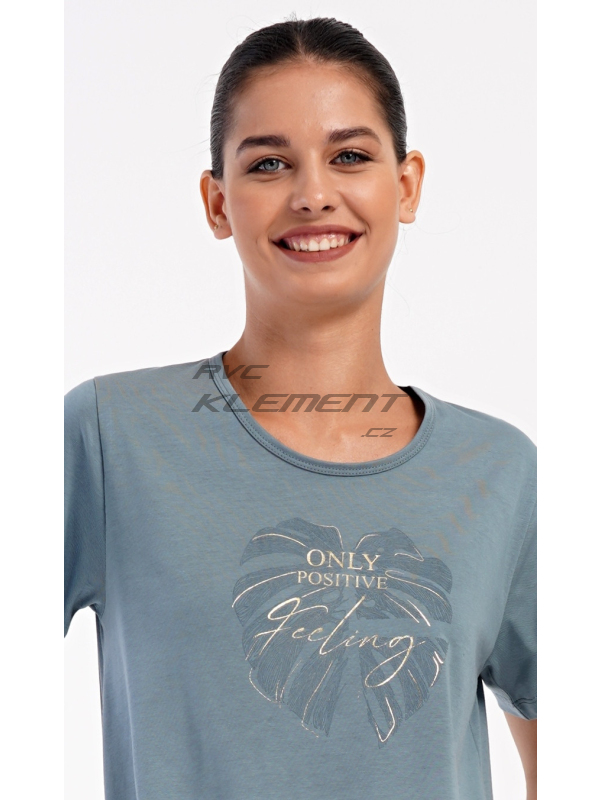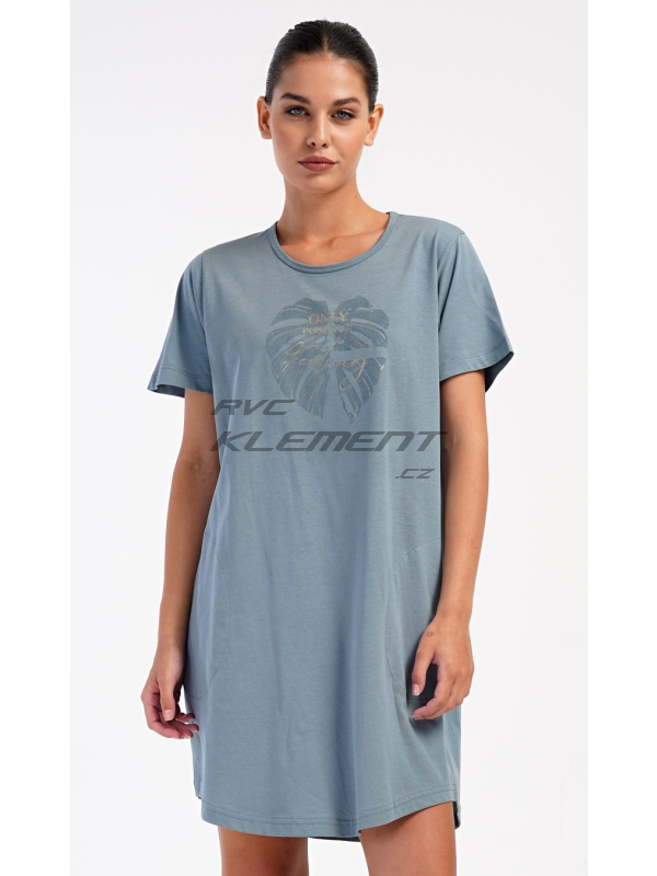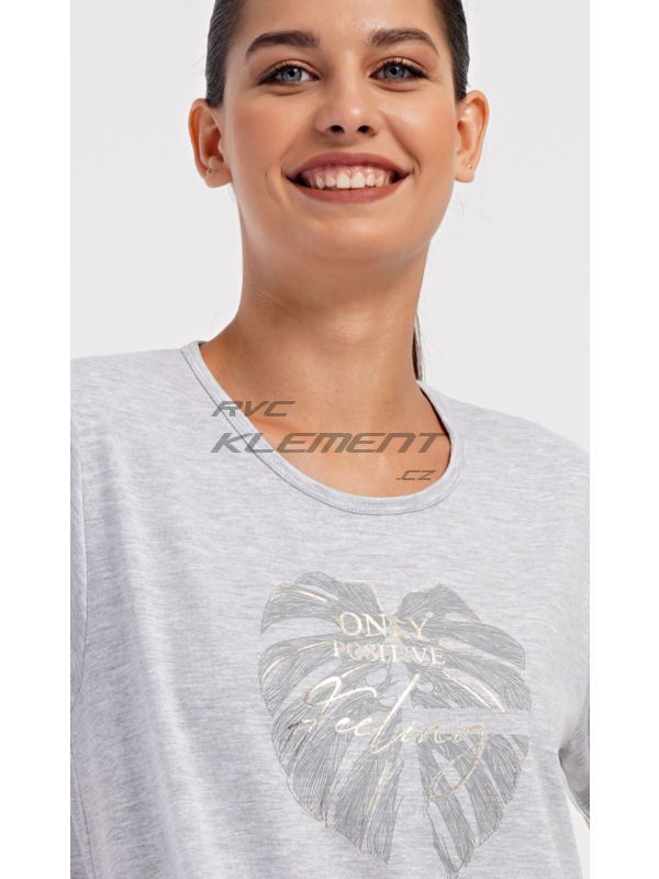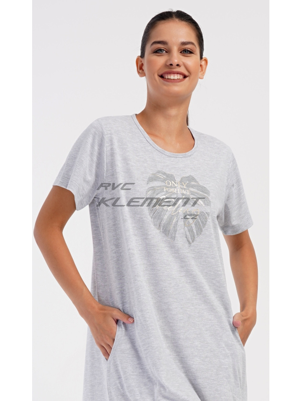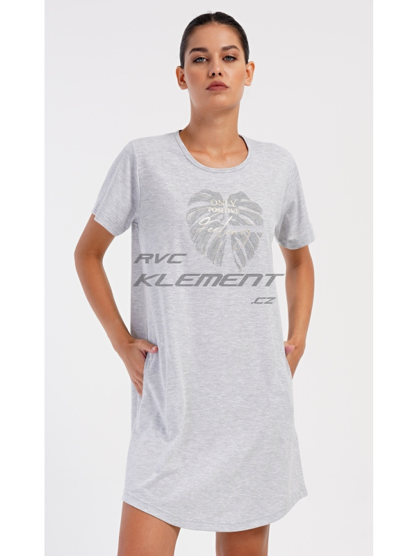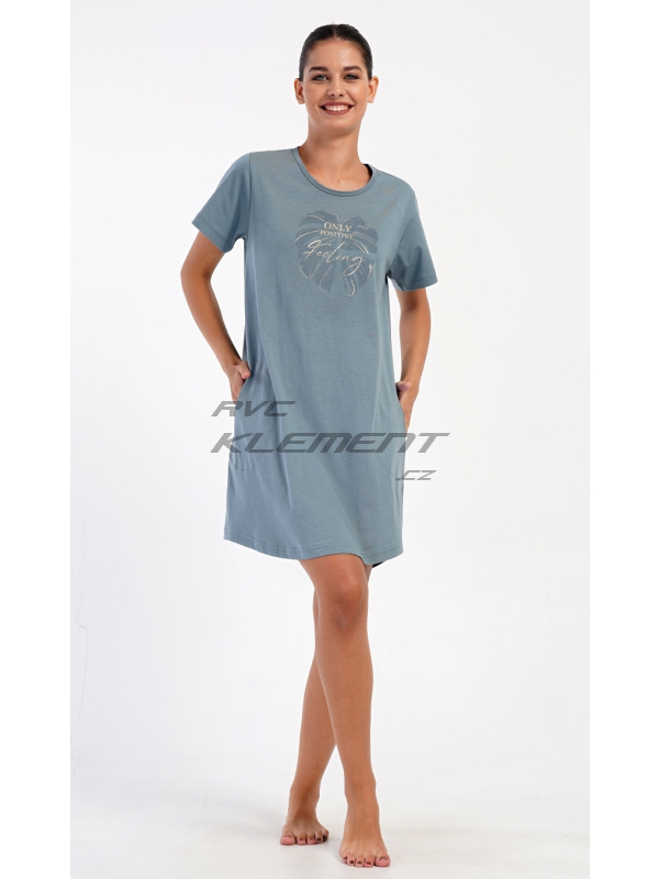 Dámské domácí šaty s krátkým rukávem Alžběta. Dámské domácí šaty s krátkým rukávem Alžběta. Domácí jednobarevné šaty s kulatým výstřihem a kapsami zdobí obrázek velkého listu a nápis ’Only positive feeling’. Použitý bavlněný materiál je příjemný a poddajný na dotek. Šaty jsou pohodlné, využijete je téměř při všech volnočasových aktivitách. Jsou vhodné na spaní i na denní nošení. Obsah bavlny u tmavě šedé barvy je 100% a u světle šedé 70%. Pokyny pro údržbu: -70% bavlna, 30% polyester Míry naměřené na výrobku: