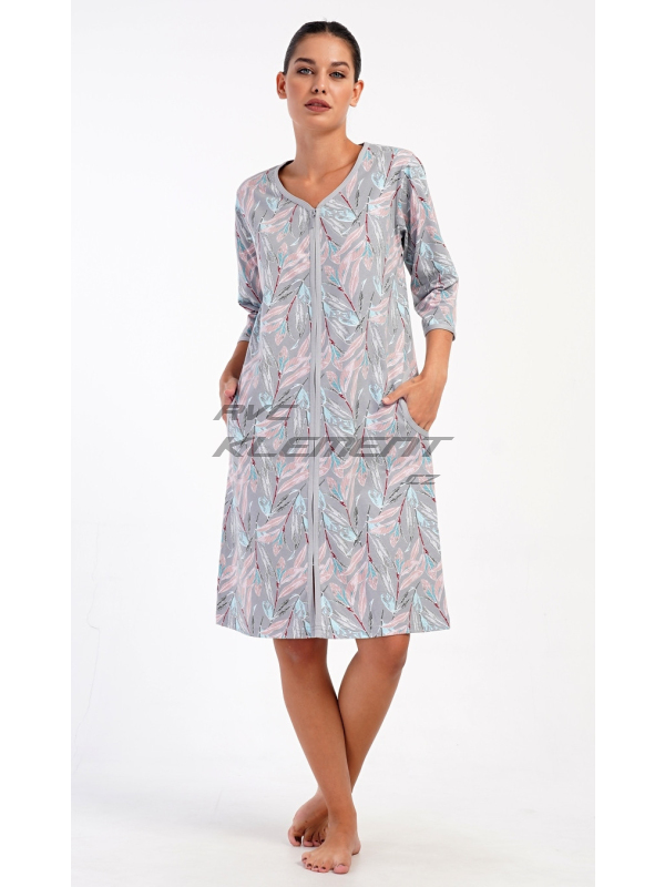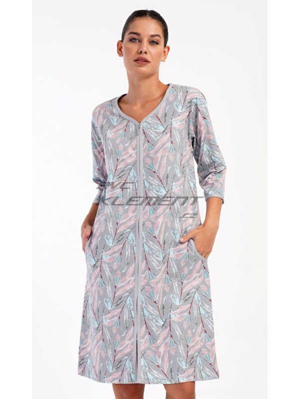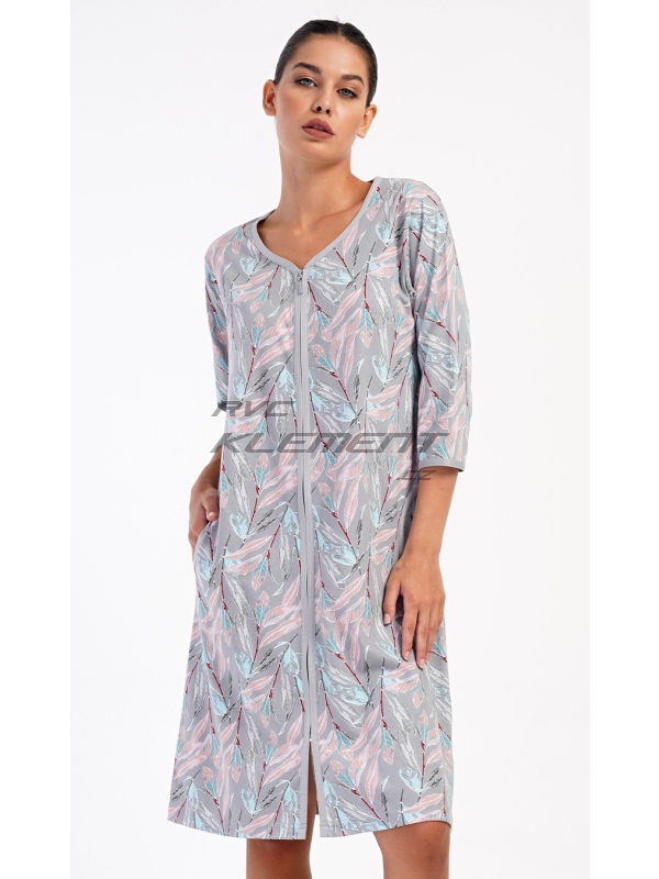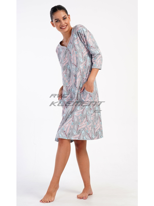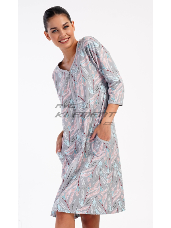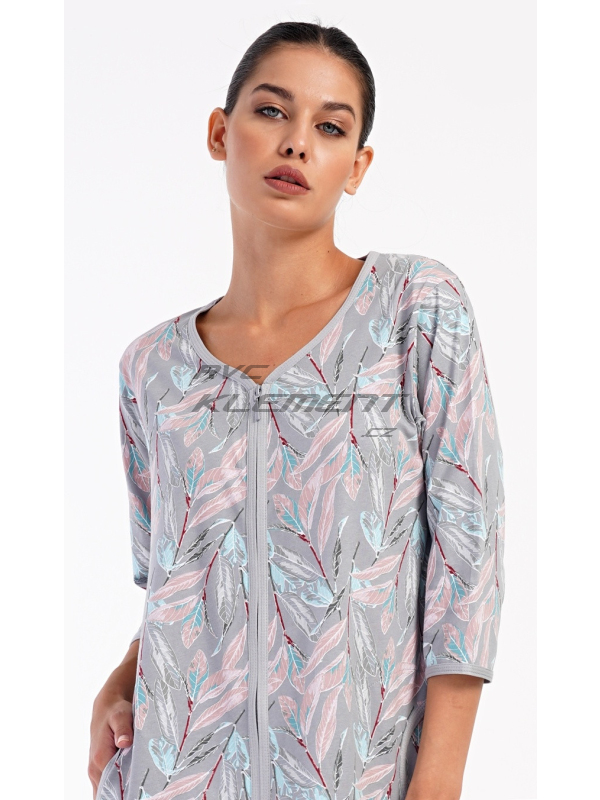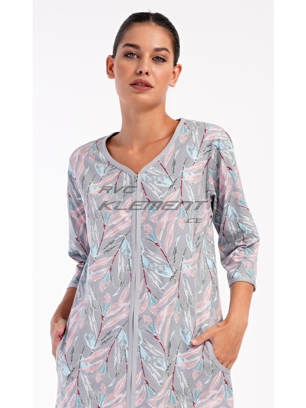 Dámské domácí šaty s tříčtvrtečním rukávem Kika. Dámské bavlněné domácí šaty s tříčtvrtečním rukávem Kika. Pohodlné rozepínací šaty v příjemné délce pod kolena využijete téměř při všech volnočasových aktivitách. Mají praktické kapsy a zapínání na zip. Šedé šaty jsou potištěny větvičkami a listy v mentolové a lososové barvě. Použitý bavlněný materiál je příjemný a poddajný na dotek. Pokyny pro údržbu: - 100% bavlna Míry naměřené na výrobku: