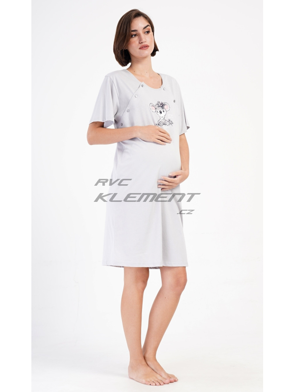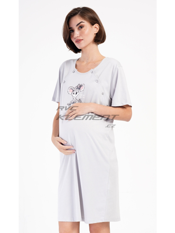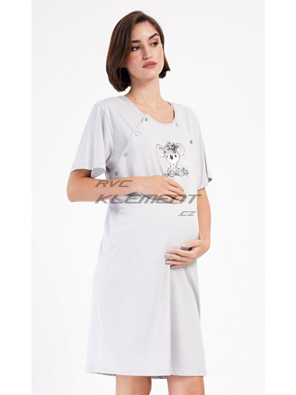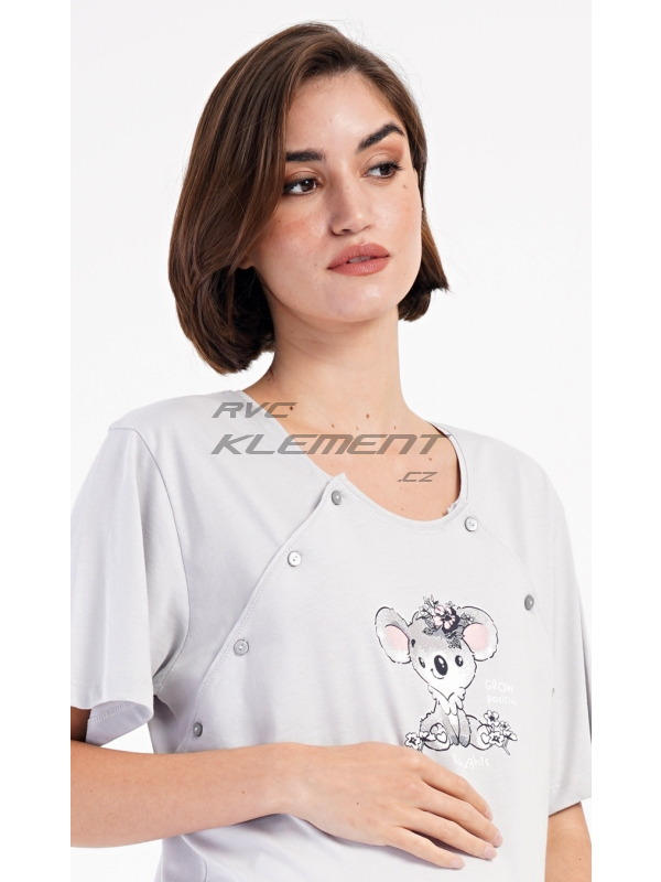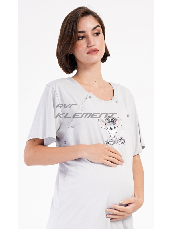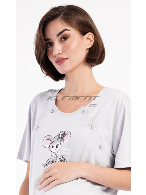 Dámská mateřská noční košile Malá koala. Dámská bavlněná mateřská noční košile Malá koala. Noční košile je svým střihem určená na dobu těhotenství, do porodnice i ke kojení. Ke kojení slouží průstřihy po stranách košile, které jsou uzavíratelné na knoflíky. Jednobarevná košile je na hrudi ozdobena obrázkem malé koaly. Použitý materiál s podílem bavlny 100% je příjemný a poddajný na dotek. Pokyny pro údržbu: - 100% bavlna Míry naměřené na výrobku:
