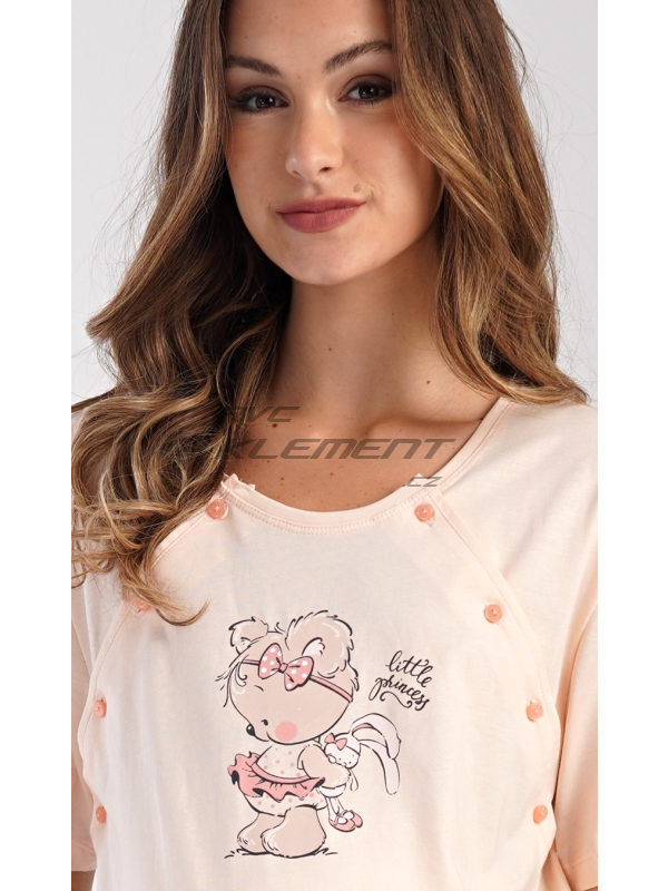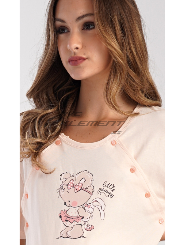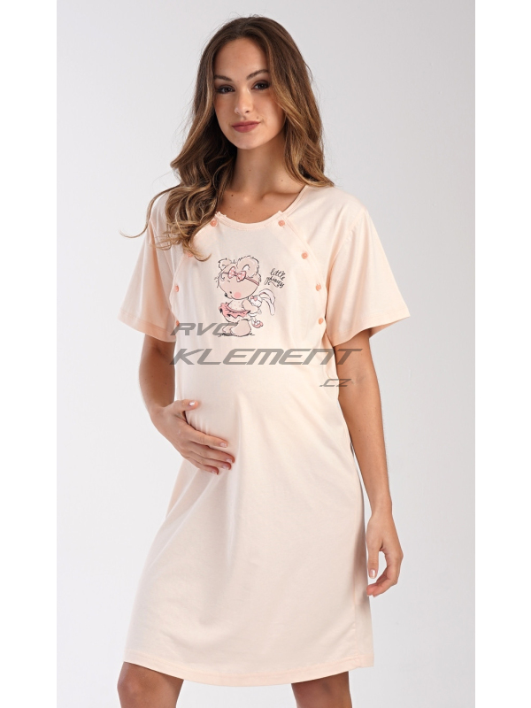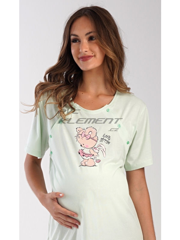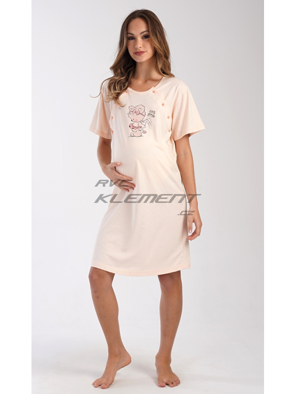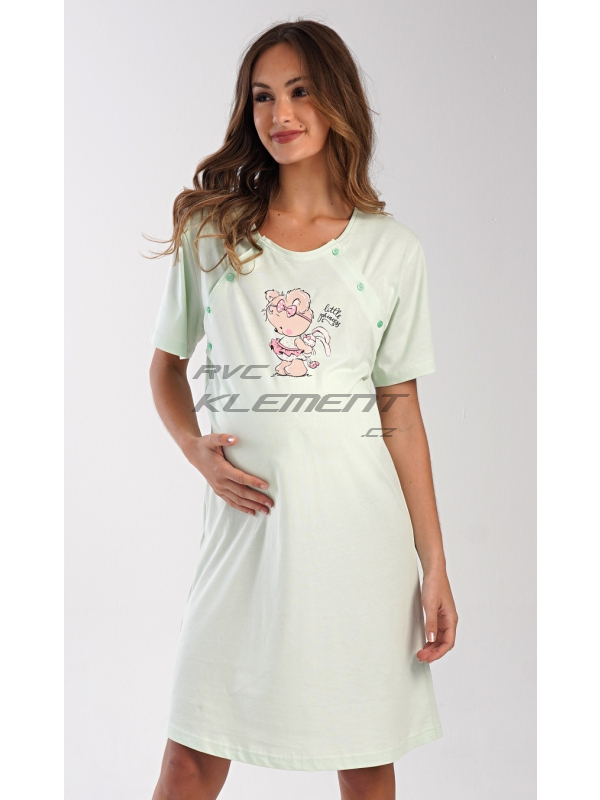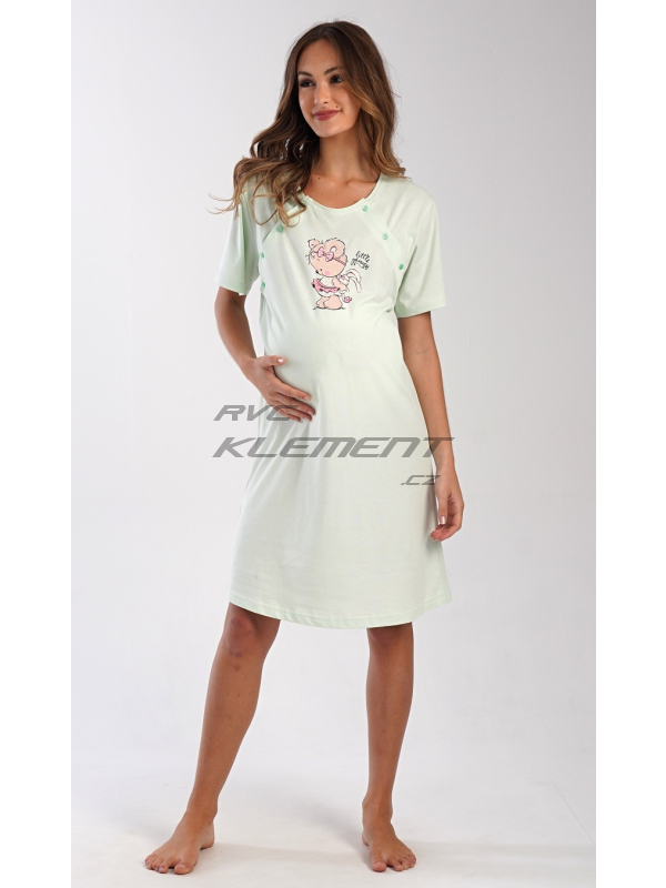 Dámská mateřská noční košile Maruška. Dámská bavlněná mateřská noční košile Maruška. Noční košile je svým střihem určená na dobu těhotenství, do porodnice i ke kojení. Ke kojení slouží průstřihy po stranách košile, které jsou uzavíratelné na knoflíky. Jednobarevná košile je na hrudi ozdobena obrázkem malého medvídka. Použitý materiál s podílem bavlny 100% je příjemný a poddajný na dotek. Pokyny pro údržbu: -100% bavlna Míry naměřené na výrobku: