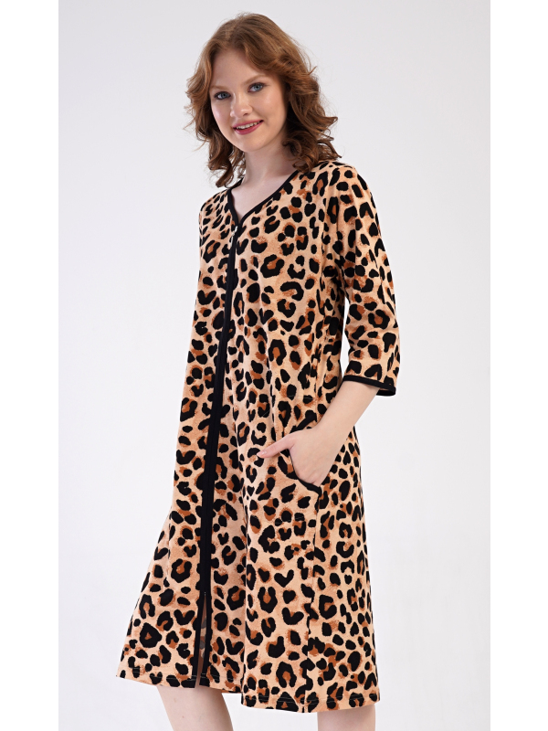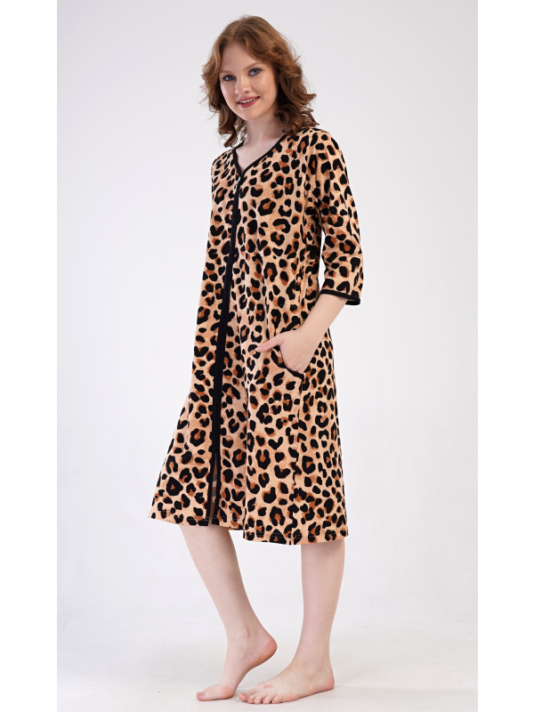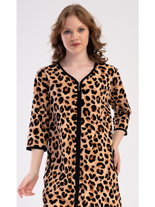 Dámské bavlněné domácí šaty s tříčtvrtečním rukávem Leopard. Pohodlné rozepínací šaty v příjemné délce pod kolena využijete téměř při všech volnočasových aktivitách. Mají praktické kapsy a zapínání na zip. Šaty jsou potištěny leopardím motivem. Použitý bavlněný materiál je příjemný a poddajný na dotek.