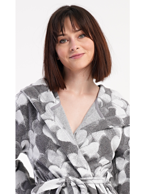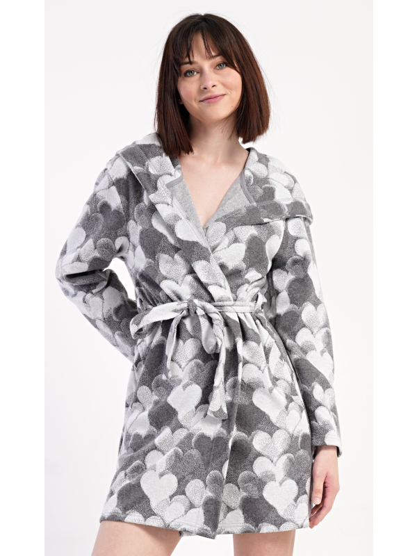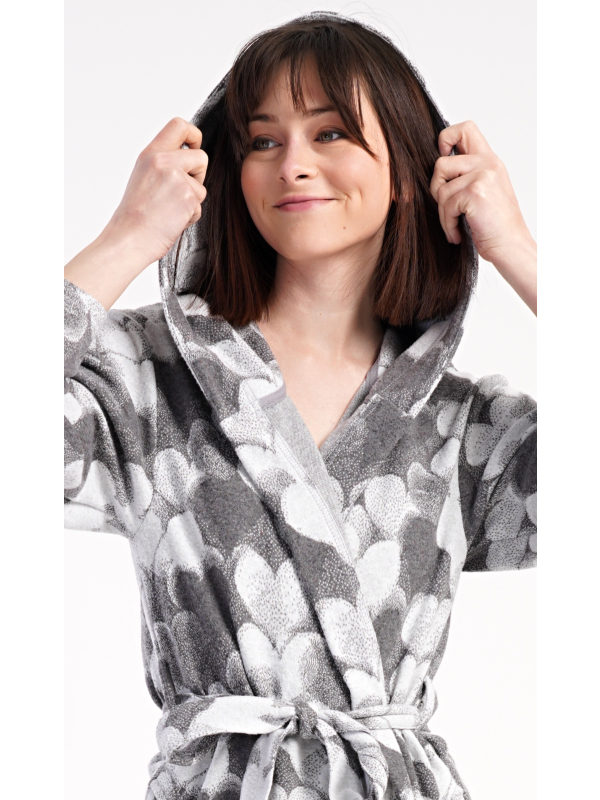 Dámský krátký župan s kapucí Srdce. Dámský krátký župan s kapucí Srdce. Dámský župánek s délkou pod kolena je potišten srdíčky v šedých tónech. Župan má pásek ke stažení a praktické kapsy. Použitý materiál s obsahem bavlny 48% je příjemný a poddajný na dotek. Oceníte ho i po koupeli a při lenošení doma na gauči. Pokyny pro údržbu: - 48% bavlna, 48% polyester, 4% lycra Míry naměřené na výrobku: