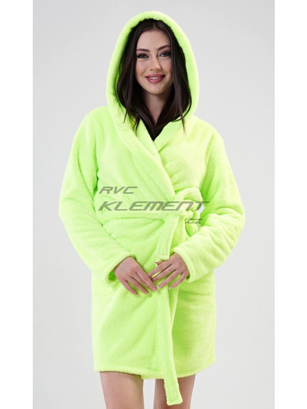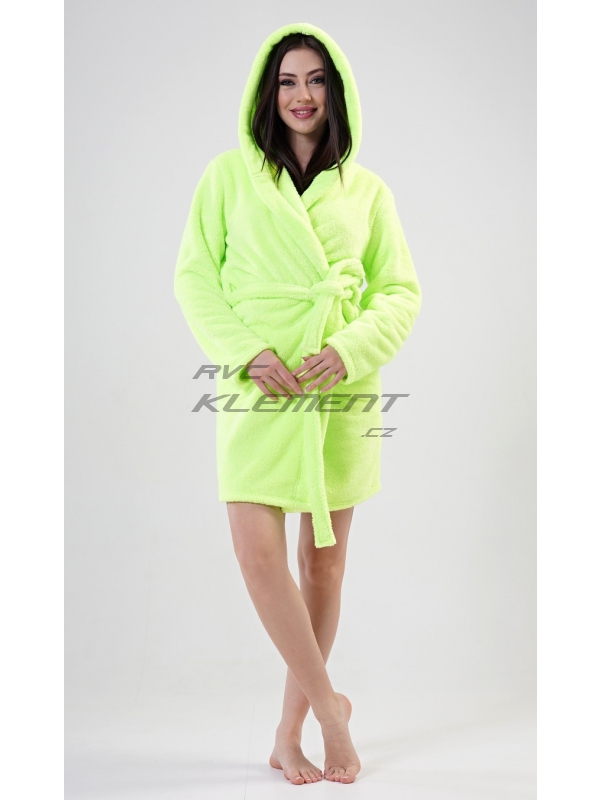 Dámský župan krátký s kapucí Limetka. Dámský krátký softový župan s kapucí Limetka. Dámský župan s kapucí, páskem k převázání a kapsami vás zahřeje při cestě do postele, i po koupeli. Použitý softový materiál je jemný a poddajný na dotek. Pokyny pro údržbu: - 100% polyester