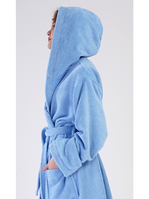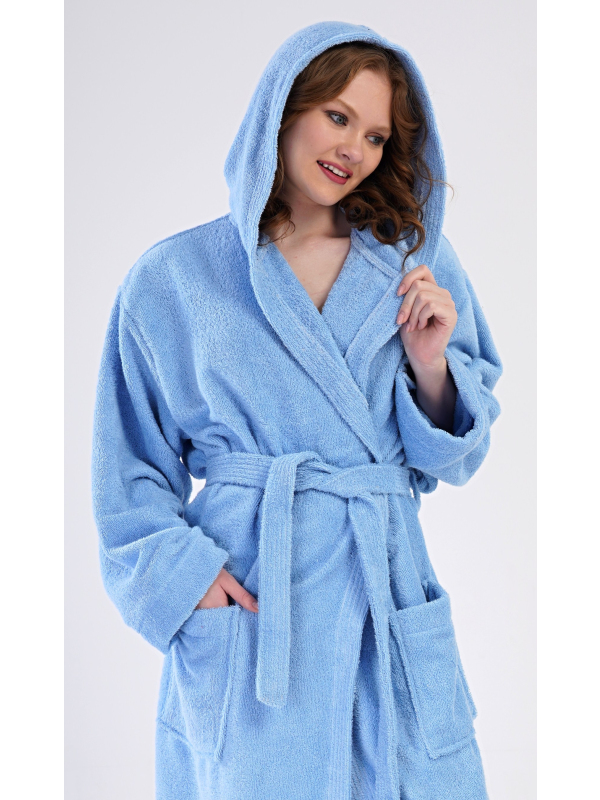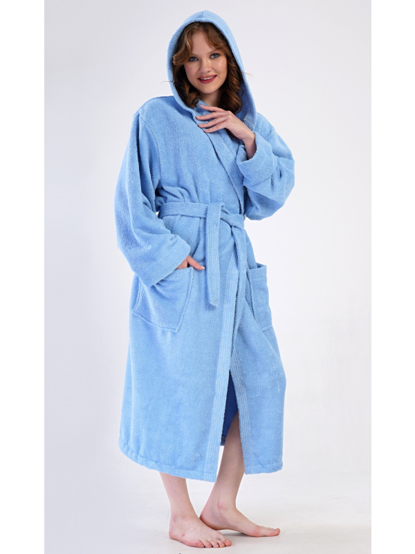 Dámský dlouhý froté župan s kapucí Modrásek. Dámský bavlněný froté župan s kapucí Modrásek. Dámský dlouhý župan s kapucí a páskem ke stažení je vhodný po koupeli i na povalování se doma na gauči. Froté župan má praktické kapsy, které oceníte při návštěvě wellness. Použitý bavlněný materiál je příjemný a poddajný na dotek. Pokyny pro údržbu: - 100% bavlna Míry naměřené na výrobku: