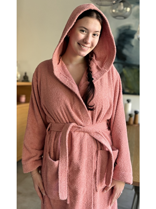 Dámský bavlněný froté župan s kapucí Broskev. Dámský dlouhý župan s kapucí a páskem ke stažení je vhodný po koupeli i na povalování se doma na gauči. Froté župan má praktické kapsy, které oceníte při návštěvě wellness. Použitý bavlněný materiál je příjemný a poddajný na dotek.